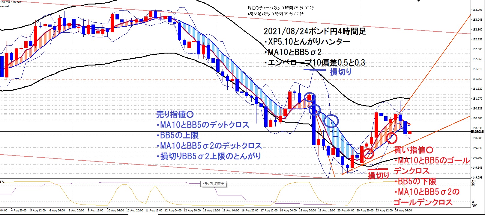 4時間足では、同じく「XP5.10とんがりハナター」で売り仕掛けをしています。MA10とMA5(BB5σ2)のデットクロス、もしくはMA10とBB5σ2のデットクロスに売り指値でした。