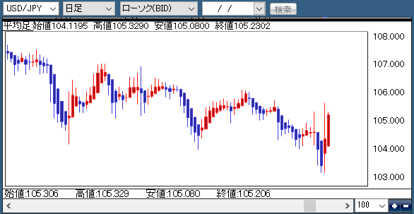 ドル円ですが、東京安値を欧州ファンドが買ってくるかです。下値104.8円、104.30円、103.8円、上値は105.5円台、105.9円台とみていますが、106円を上抜けば106.5円、107円でしょう。