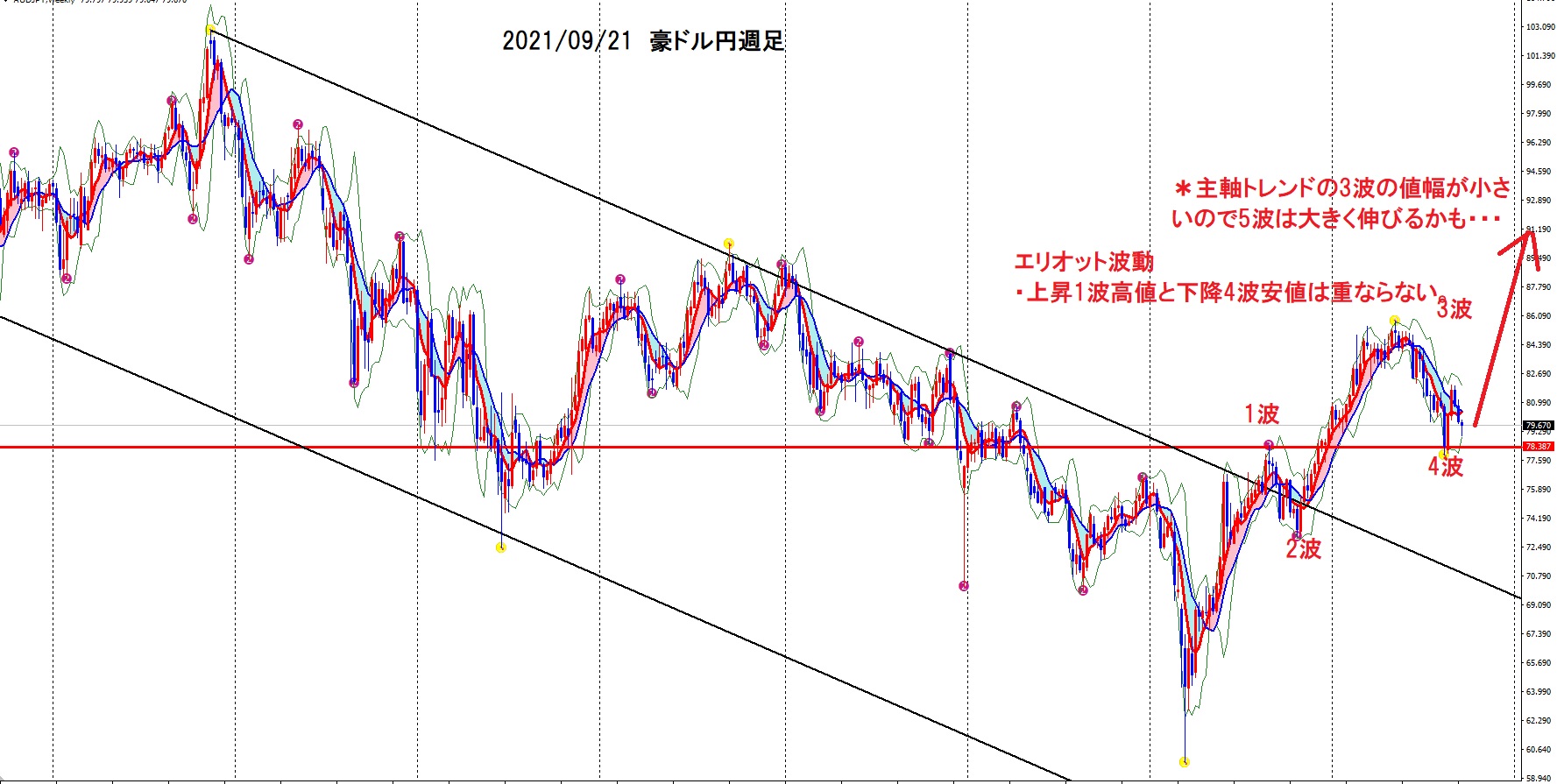 注目の先行銘柄は豪ドル円で、きれいなエリオット波動を描いて、アップトレンド5波に入るかです。また、トレンドの主軸となる3波が小さいので、5波は大きく伸びるかもです。ただ、フィラー(5波に達成せず3波天井でトレンド転換する失敗という意味)というのもエリオット波動にはあるので、注意です。