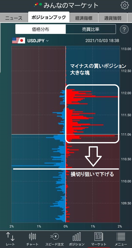 ドル円はポジションブック(みんなのFX)から買玉の大きな塊が112~111円にあり、これが消去されるとみて、4時間足レジサポライン109.5円、移動平均線10と5のデットクロス111.4円としました。
