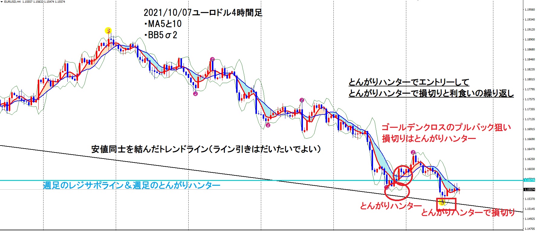 ②ユーロドルも昨日に4時間足の安値同士のトレンドライン下限に来ており、反転の可能性があること